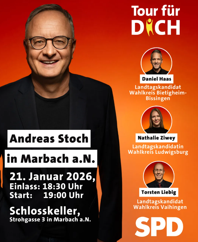 Unser SPD-Spitzenkandidat Andreas Stoch kommt in unseren Landkreis - und möchte Dich herzlich dazu einladen. Weil es um den Menschen geht, wenn es um Politik geht. Mit dabei sind auch die drei SPD-Landtagskandidaten aus unserem Landkreis Ludwigsburg: Nathalie Ziwey (WK Ludwigsburg), Daniel Haas (WK Bietigheim-Bissingen) & Torsten Liebig (WK Vaihingen). 22. Januar, 19 Uhr, Schlosskeller Marbach am Neckar.